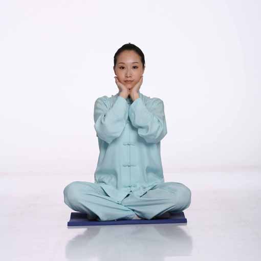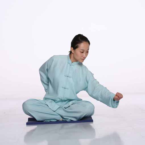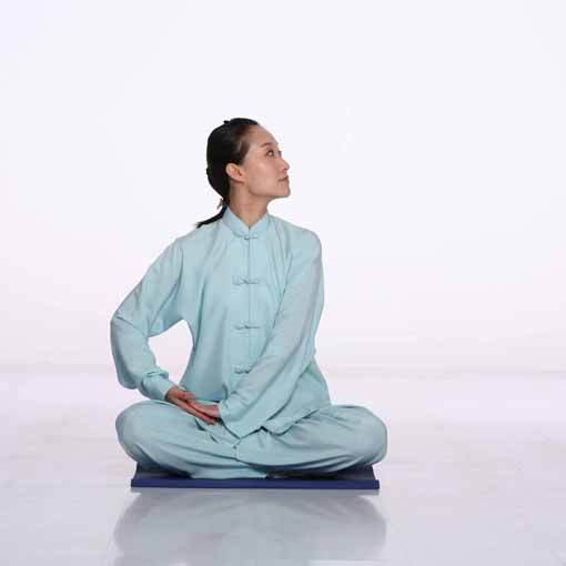 上体左转,两臂内旋平举过程中,内气引发的内劲柔和地作用于手掌或臂膀,有时感觉到一股上推之力,或感觉到有股轻微的下拉之力。推力来源于丹田及命门之气引发的与肢体运动方向相同的作用力——劲力,轻微阻力是身体局部(如本功法中的手臂)经络疏通的部位人体内气与天地外气融通,运动着的手臂内气穿越相对静止的天地外气而发生的相互作用,由此产生了与动作方向相反的反作用力。正如跑步时,我们穿越相对静止的空气,空气反过来对人体产生的阻力。练功中掌心的内气阻力体会最多,也是每个练功者在漫长的练功历程中******感知到的,如下按时,有按浮球之感,上举时,有托物之意等都是手掌运动时感知到的天地外气阻力。对内外之气及劲力、阻力的感知由明净之心自然而发,并非有意感觉,要听之任之、存而不感,不执著于这种意境,心中明了即可,正如天空中飘浮的一朵白云,来无影去无踪,任其自然而然生发和消逝;两掌轻轻地合于小腹前,两手五指分别虚掩两掌心,形成一个中空的小空间,内气蕴藏其间;头向左转,两掌向右移至右大腿内侧的过程中,鼓荡于掌心的内气似乎欲拉住两掌前行,促使转头移掌的动作柔和连贯地完成;左肩下沉,左掌根均匀而缓慢地向下压右掌五指,同时下颏持续向上用力,使得抬头匀速而不间断地进行,整个脊柱有伸展、抻拉、撼拔之感。抬头中,意在大椎穴,有利于疏通督脉,进而促进手足三阳经气血运行。